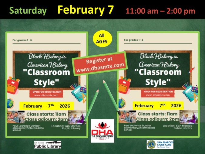 Saturday, February 7, 2026, from 11 AM – 2 PM. at the San Marcos Public Library