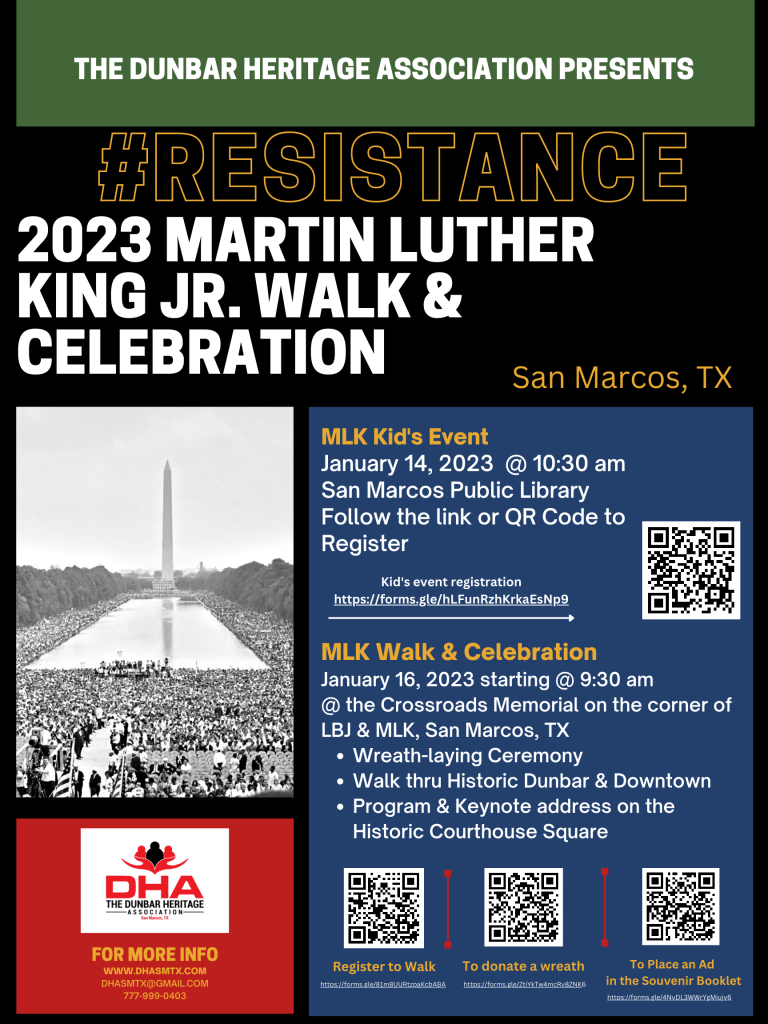 The Dunbar Heritage Association proudly will proudly host the San Marcos Martin Luther King Jr. March and Celebration. This year’s MLK Jr. celebration will feature the events below.