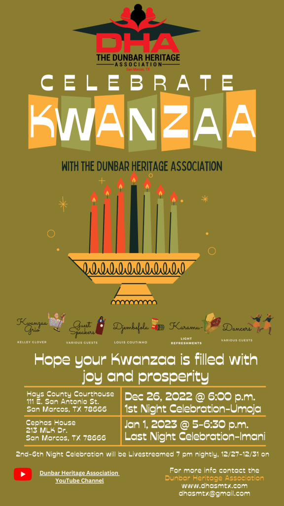 UMOJA! 1st Night Celebration on December 26, 2022, 6:00 p.m. at the Historic Hays County Courthouse, 111 E. San Antonio St., San Marcos, TX 78666