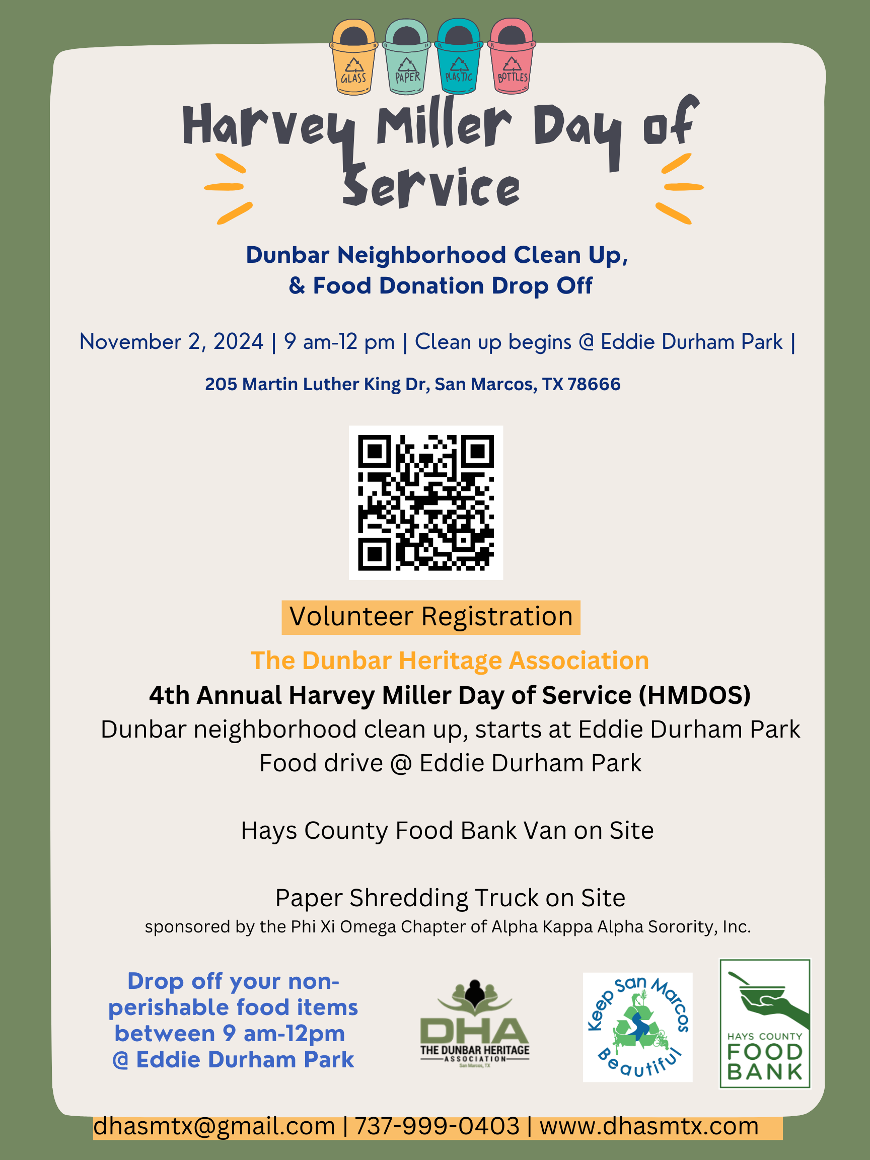 The Dunbar Heritage Association, in collaboration with Keep San Marcos Beautiful and the Hays County Food Bank, will host its 4th annual Harvey Miller Day of Service (HMDOS). This year’s HMDOS will include a clean up in the Dunbar neighborhood, a food drive, and a celebration.