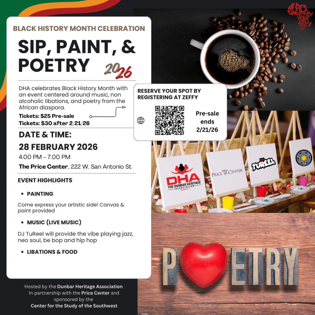 The Sip, Paint, & Poetry event will highlight poets from the African diaspora to educate and celebrate Black poetry and the Black aesthetic. The event will feature poetry, live music, painting/adult coloring, and food. This is one of two Black History Month events hosted by DHA.