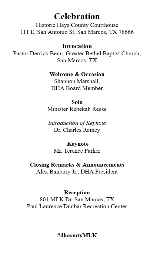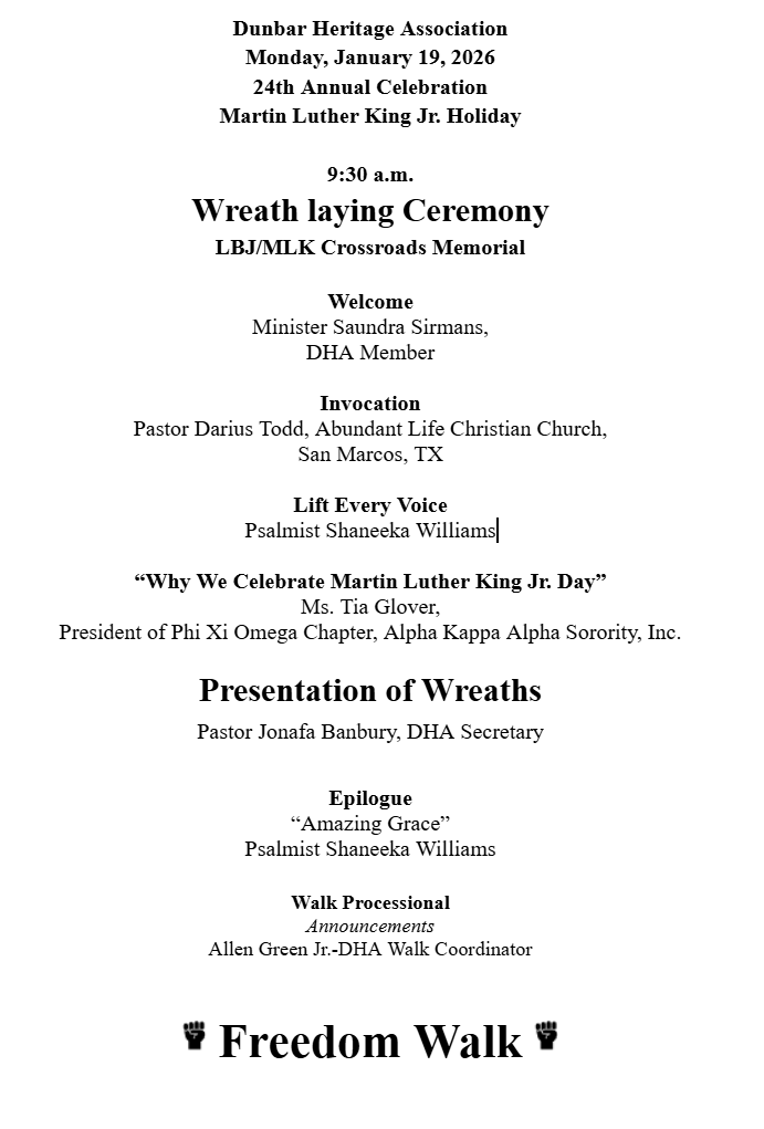 The Wreath-laying Ceremony will begin at the LBJ/MLK Crossroads Memorial in San Marcos, TX, at 9:30 a.m. on January 19, 2026. All other times are approximate.