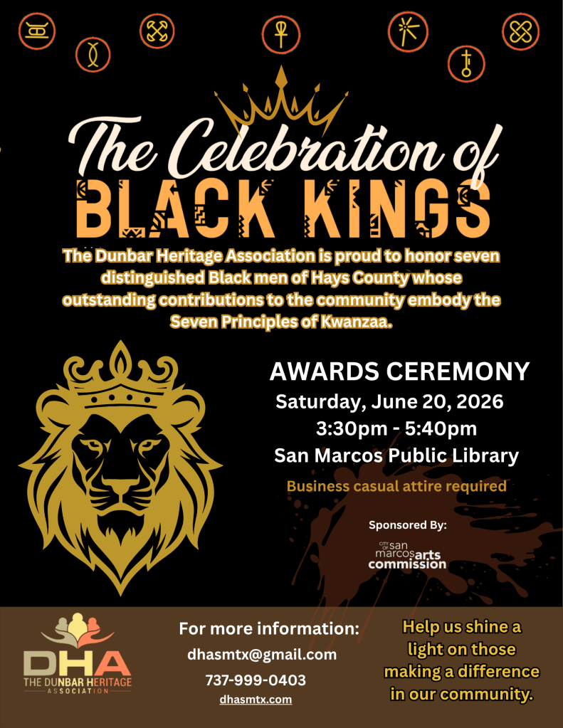 The Dunbar Heritage Association is proud to honor seven distinguished Black men of Hays County whose outstanding contributions to the community embody the Seven Principles of Kwanzaa.