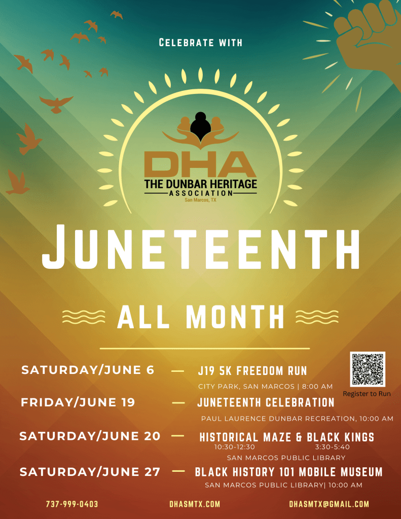 Continue readingInformation about past and upcoming Juneteenth Celebrations hosted by the Dunbar Heritage Association in San Marcos, TX.